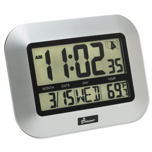 6645016611877 SKILCRAFT LCD Digital Radio-Controlled Clock, 7.25" x 9.75", Silver Case, 2 AAA (sold separately)