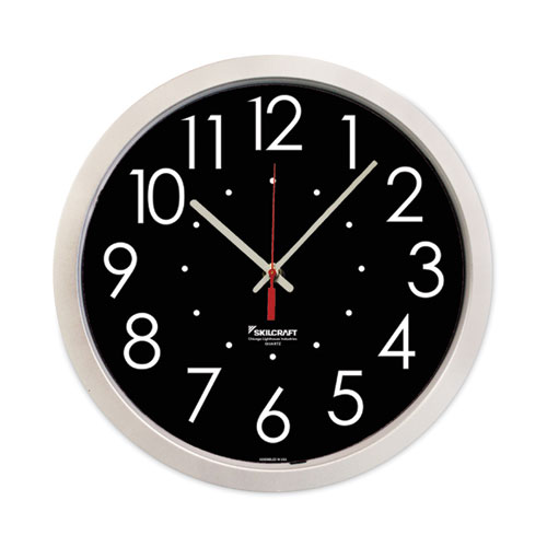 Make telling time easy with the SKILCRAFT® High Contrast Wall Clock. Large, bold white numbers against a contrasting black background make this wall clock easy to see from a distance. This clock features easy, secure mounting hardware and comes in a shatter resistant UV-protected lens. Accurate within +/- two minutes per year. Frame and body are made from recycled materials. Uses one AA battery (not included).