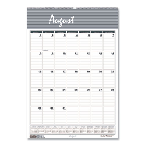 Ruled daily blocks keep notations neat. Full-year reference calendar aids in planning throughout the year. Neutral graphics match any décor. Wirebound with a full chipboard backer and a sturdy wire hanger. Made entirely of recycled materials.