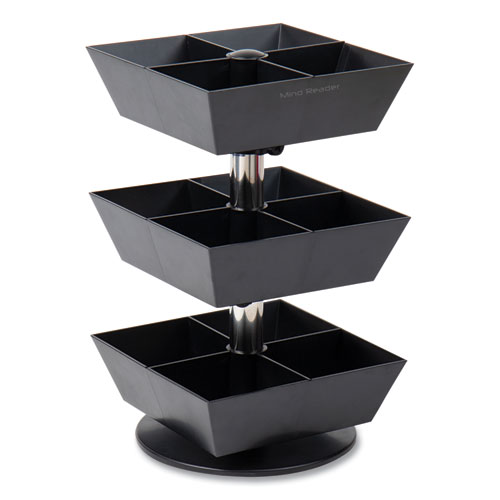Tea time at your fingertips. Remove the chore of digging through tea boxes and pouches for your favorite pick-me-up cup of warmth with the convenient 12-compartments available in this tea carousel. Separate the green tea from the black tea and give decaf options their own space. Alternatively, save one of the tiers for your packets of honey, sugar, creamer, or lemon. Each of the three tiers is only 2.05 inches tall. You can easily pick it up and move it around your home or office kitchen. It's also a great addition to a hotel or restaurant coffee bar. The tiers are black and blend in with most kitchen decor. The carousel spins around so you can easily turn the tiers to find what you're looking for. Cleaning the carousel is easy with a wet cloth and mild soap. Perfect for your office and home kitchen. It's also a thoughtful housewarming present paired with your favorite teas and condiments!