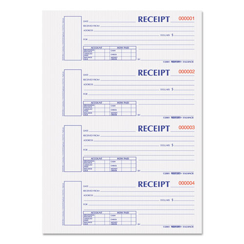 Durable Hardcover Numbered Money Receipt Book, Two-Part Carbonless, 6.88 x 2.75, 4 Forms/Sheet, 300 Forms Total