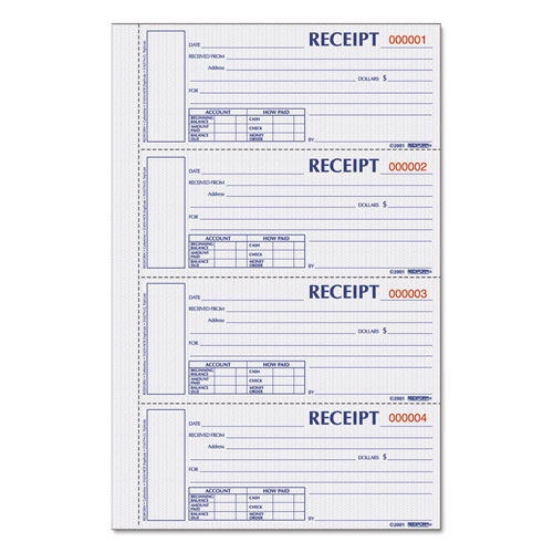 Durable Hardcover Numbered Money Receipt Book, Three-Part Carbonless, 6.88 x 2.75, 4 Forms/Sheet, 200 Forms Total