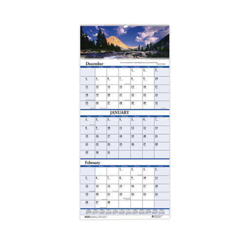 Each page features a unique scenic image and an inspirational quote. Three-month per page layout with current month unshaded to contrast with past month and next month. Unruled daily blocks for planning on all three months. Strong wire-binding firmly keeps the pages together and in place. Includes a sturdy wire hanger to easily hang the calendar on the wall and a full-year reference calendar on each page. Made entirely of recycled materials.