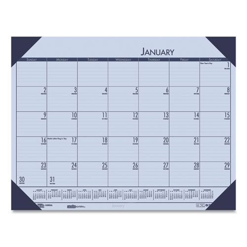 Pastel color recalls a color from nature. Strong, reinforced color-matched leatherette corners complement the pad's paper while keeping the pages in place and protected. Full-year reference calendar aids in planning throughout the year. Features numbered weeks, Julian dates and days remaining. Lightly ruled daily blocks help keep notations neat. Made entirely of recycled materials.