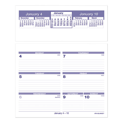 Weekly pages flip up and drop into convenient storage base. One week per page, ruled for open scheduling. Current, two past and two future months reference; federal holidays highlighted. Printed in blue and red inks.
