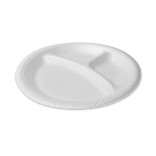 Foam Dinnerware, Plate, 3-Compartment, 9" Dia, Poly Bag, White, 125/sleeve, 4 Sleeves/bag, 1 Bag/pack