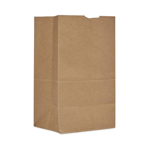 Kraft paper grocery bag. Durable construction for reliable containment. Flat bottom keeps items secure and allows bag to stand on its own.