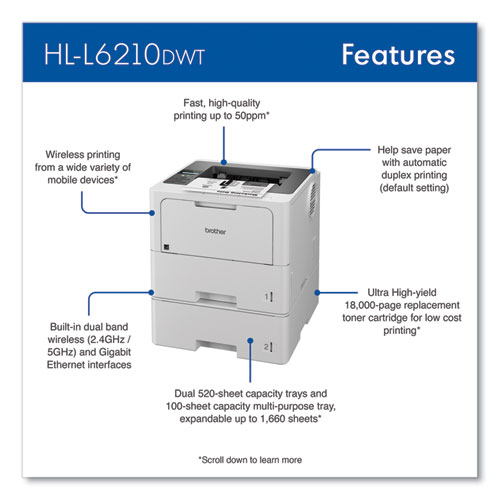 The Brother HL-L6210DWT business monochrome laser printer is a great choice for busy offices and workgroups with higher print volumes that need fast, high-quality output, low-cost printing, large paper capacity and advanced security features. This high-performance printer helps to increase productivity with a fast print speed of up to 50 ppm. Reduce paper refills with dual 520-sheet capacity paper trays. Offers a large, expandable paper capacity that is scalable as your business needs grow. Delivers low-cost printing by using the TN920UXXL Brother Genuine ultra-high-yield replacement toner cartridge. Triple Layer Security features help to limit document and device access and protect against network intrusions. The HL-L6210DWT also provides flexible connectivity with built-in Gigabit Ethernet and dual band wireless networking, plus convenient mobile device printing to meet mobile workforce demands.