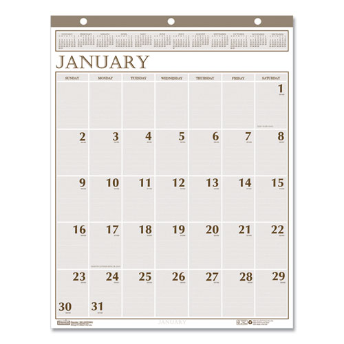 Wall calendar is printed in dark brown and beige colors for an elegant look. Lightly ruled, large daily blocks help keep notations neat. Brown, simulated-leather binding with a three punched holes provides rigidity and a classic look. Full, 12-month calendar for long-term planning. Each page is perforated at the top for easy tear-off as needed. Made entirely of recycled materials.