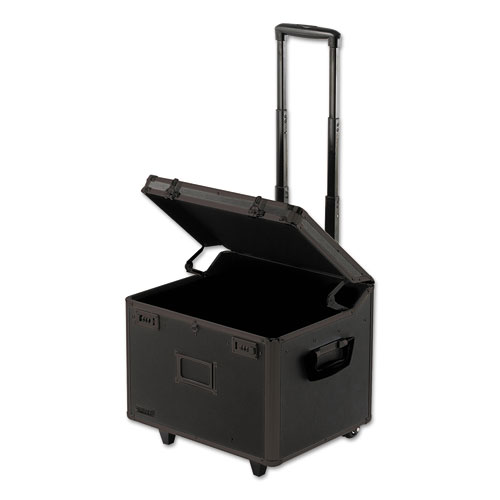 Telescopic handle and sturdy wheels give you easy mobility while two combination locks provide added security. Built-in rails accommodate two hanging file sizes. Panels are made of diamond-embossed PVC. Features chrome label holder plate, chrome corners and aluminum trim. Telescopic handle extends to 32". Also includes side handles. Front stoppers provide level placement.