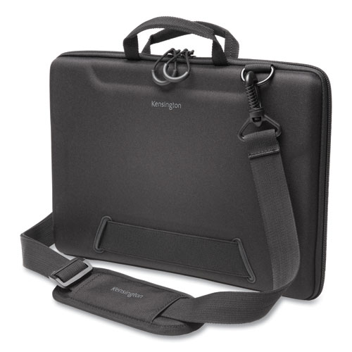 Tough, water-resistant shell resists spills and tears. EVA foam bumpers hold the Chromebook tight, provide shock-absorption, and protect from drops, bumps, bangs, impacts, scratches, and more. Clamshell stay-on design opens 180-degrees, so students can leave the case on while they work. Non-slip rubber feet keep the case from sliding or shifting while working. Ventilation channels ensure proper air flow and prevent overheating. Hand strap and detachable shoulder strap provide easy and secure carrying options. Paracord zip pulls are durable and easy for smaller hands to grasp. Transparent ID holder makes identification easy. Slim and compact design easily fits into a backpack or Kensington Charging Case.