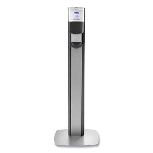 Elegant stand makes PURELL® Hand Sanitizer available anywhere. May be personalized with you message on the front and back of the stand. Low profile baseplate designed to maximize stability. Lightweight and easily moved when cleaning the facility. Silver baseplate hides dirt and always looks good.