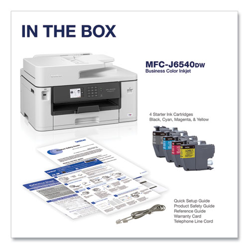 The MFC-J6540DW Brother Color Inkjet All-in-One Printer delivers economical, reliable, professional-quality printing for any small office or home workspace. Print, scan, copy, and fax up to 11" x 17" (ledger) size paper. This all-in-one print solution raises the bar on simplicity and productivity. With print speeds up to 28 ppm (black and color), and the 250-sheet paper tray capacity makes handling large print jobs a breeze. Robust Triple Layer Security helps safeguard sensitive documents and securely connect to the device and network while printing. Work the way you want - it's easy to connect and print wired, wirelessly (2.4 GHz/5 GHz), or even on the go with the Brother Mobile Connect App. This printer comes with compatible cartridges for the Brother Refresh EZ Print Subscription Service, which can help erase the worry of running out of ink ever again. Have it all, at an affordable price, with the Brother MFC-J6540DW Color Inkjet All-in-One Printer.