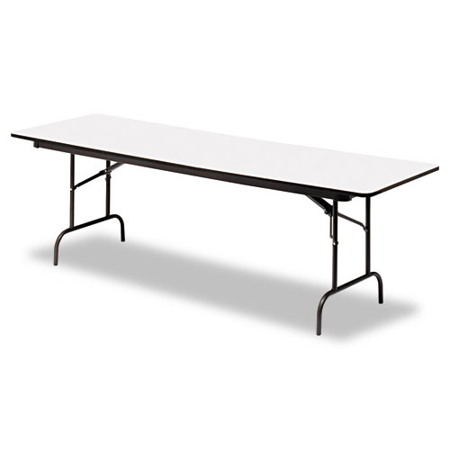 Wear-resistant, 3/4" thick melamine top with vinyl T-mold edge. Melamine sealed underside helps prevent moisture absorption. Full perimeter steel skirt support with plastic corners to protect surface when stacking. 1" diameter, heavy gauge steel legs with heavy-duty foot caps to protect floors. Heavy-duty leg supports and gravity leg lock for secure set-up. Folds to 2-1/2" for compact storage.