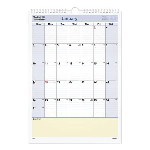 Note what's important to stay organized and focused all year long. Wall calendar's highlighted and ruled QuickNotes® section accommodates your task and takeaway notations, making it easy to stay mindful of everything that's important. One month per page format also features generously sized daily blocks with all important holidays listed as well as monthly reference calendar blocks—everything you need to stay on track. Metal twin-wire binding helps ensure everything stays together while allowing you to easily fold back each past month, so you can stay current and up to date. Sturdy chipboard backing doubles as an excellent writing pad, making it easy to jot down your notes regardless of where the calendar is hung. Printed entirely on high-quality paper for a smooth writing experience with superior ink-bleed resistance.