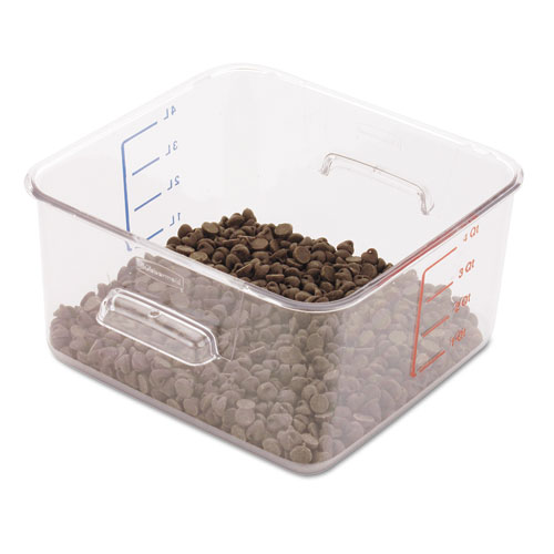 The Rubbermaid Commercial Carb-X Space Saving Food Storage Container features graduated measurements on the side to make it easy to measure contents. The square shape saves space while the break-resistant polycarbonate provides durability and strength.