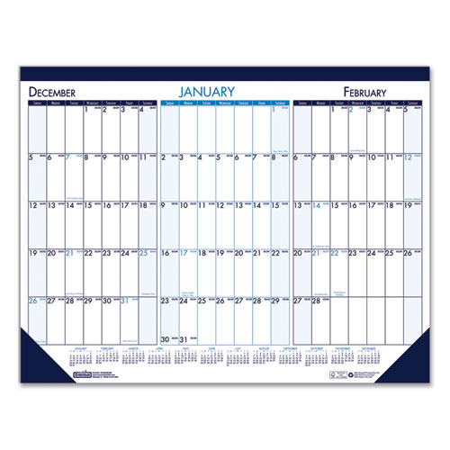 A unique desk pad calendar that has a three-month view to plan ahead and look back all at once. Includes 12 pages with prior, current and future months. The pages are stitched at the top with blue leatherette binding and matching reinforced corners for durability throughout the year. Each page is perforated at the top for easy tear-off as needed. Holiday dates printed in light blue to stand out. Made entirely of recycled materials.