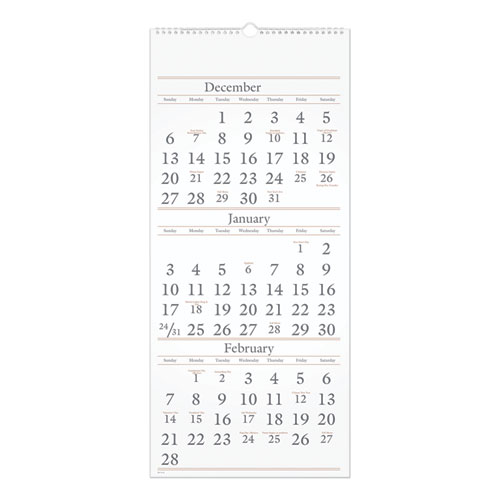 Vertical format calendar fits easily in compact spaces. Quality buff paper. Three months per page: past, current and future months. Large, easy-to-read numbers. Federal holidays highlighted. Chipboard backing; white wirebound with hanging loop. Printed on high-quality paper with superior ink bleed resistance.