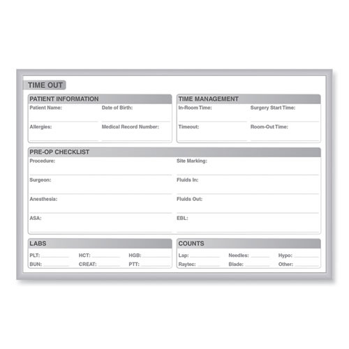 Visually track checklists for surgeries and other procedures with Ghent's pre-printed Time Out whiteboard to improve retention of important information. The graphics on the erasable boards improve communication and reduce anxiety for patients and employees. The entire surface easily wipes off with a soft cloth, disinfectant wipe, alcohol or water. Ghent's graphic whiteboards are resistant to bacteria and germs, which helps with infection prevention. Each board comes in a sleek 0.25 aluminum frame and includes our detached SmartPak tray. Graphics are produced in gray to seamlessly match any interior and will never stain, ghost or fade. Ships to you in Ghent's worry-free packaging, designed specifically for shipping whiteboards.