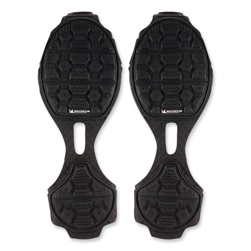 TREX Spikeless Traction Devices for shoes reduce the risk of slips and injuries by providing spike-free traction on slick surfaces. Powered by Soles by Michelin, these are the industry's most advanced spikeless traction device. Designed for work environments where spiked ice cleats are not preferred, these shoe and boot grips make for easy and safe transition between indoor and outdoor. To achieve traction without spikes, the treads are constructed with a Michelin ice control compound, the same innovative technology found in their winter driving tires. Strategically placed grooves allow for efficient water evacuation when pressure is applied. Preventing water build up is particularly beneficial on smooth indoor surfaces. Micro-pumps increase adhesion by properly distributing pressure to maintain high surface contact on icy surfaces. The tread is designed with block sipings that create additional surface area for increased grip on snowy surfaces.