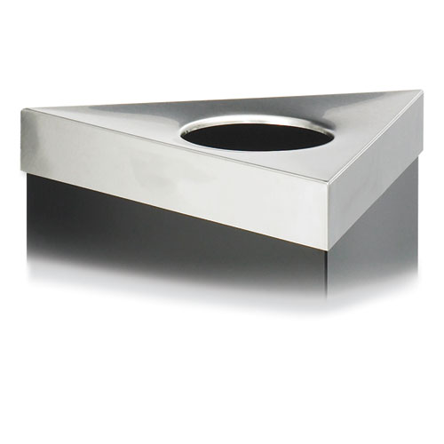 Sleek, stainless steel triangular lid has laser-cut inscription (unless otherwise specified) to identify recyclables. Part of Trifecta™ flexible design with four receptacles (sold separately), they offer a multitude of configurations to accommodate any workplace.