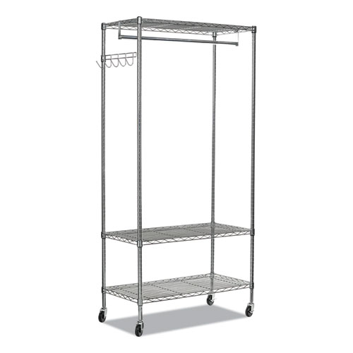 Time-saving design assembles in minutes without tools. Strong welded wire construction that allows air circulation and helps reduce dust buildup. Double-sided for quick access to items. Rack features hanging rod for garments, five support hooks for umbrellas, bags, and other items to accommodate your needs. Three shelves adjust in 1" increments and support 350 lbs. on each shelf. Four casters for quick mobility and two lock when it has reached your destination. Total unit capacity is 500 lbs. if used with casters. Hangers not included.